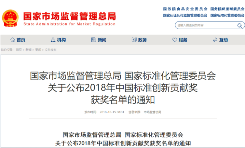 国家市场监督管理总局 国家标准化管理委员会关于公布2018年中国标准创新贡献奖 获奖名单的通知 |